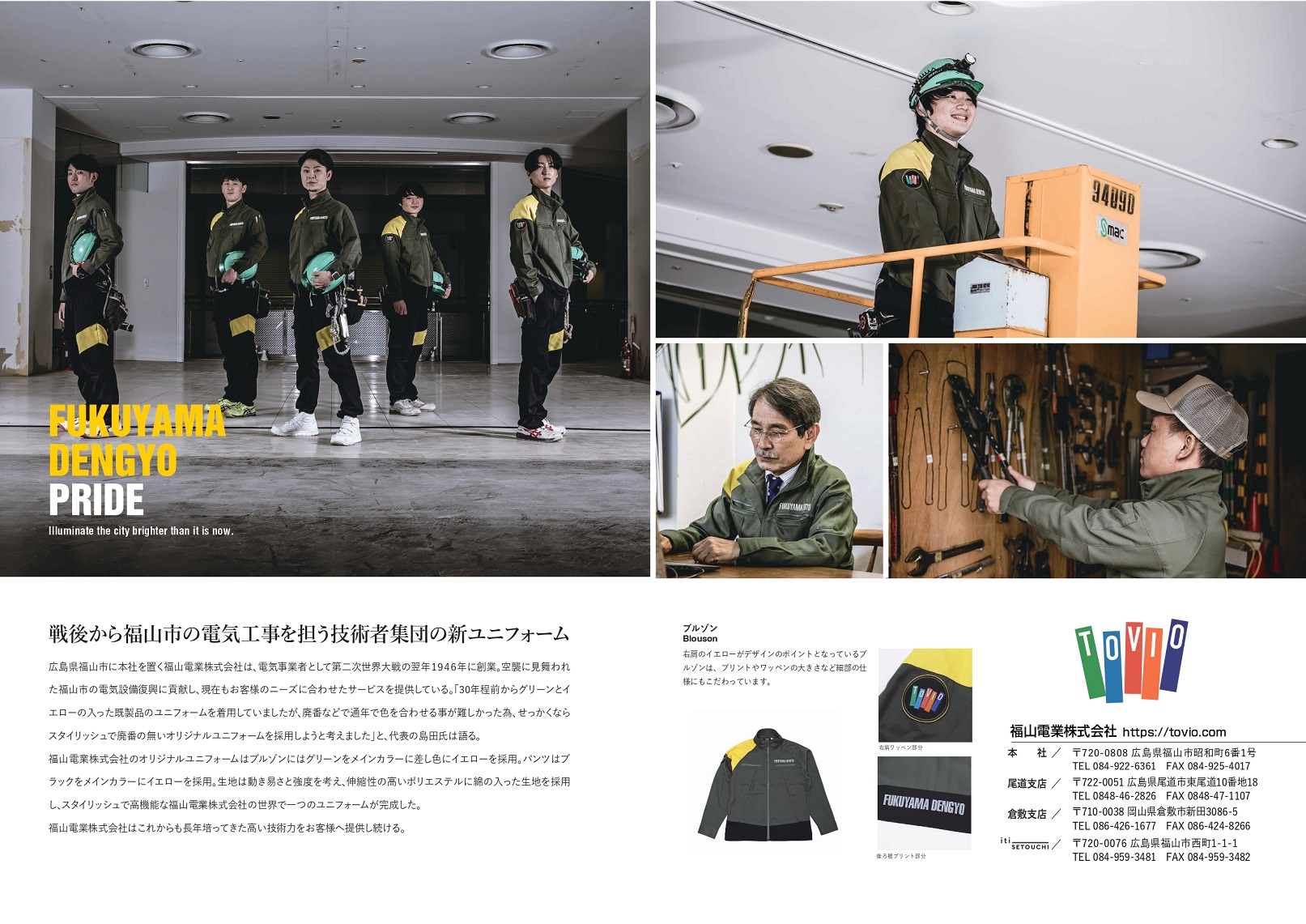 およそ30年間着用し、福山電業カラーとして地域の皆様に認識頂いておりました「グリーン×イエロー」のカラーを踏襲しつつも、より機能的でより印象的な、世界で一つのユニフォームに仕上がっております。